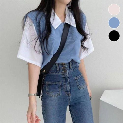 여름용 반팔 니트 카라 조끼 레이어드 티셔츠 WFLLPWM