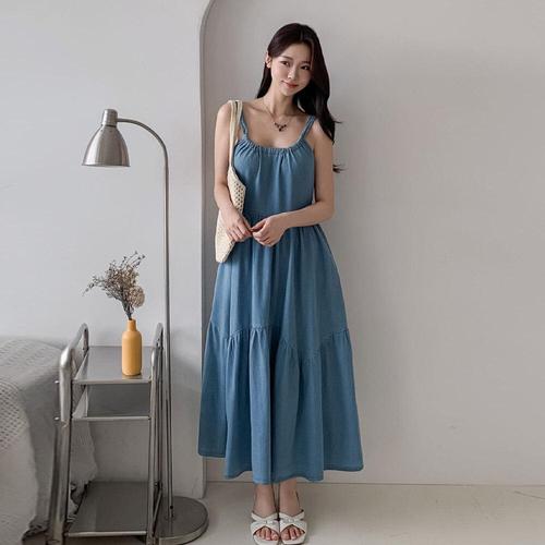 [유야]여성 데님 셔링 나시 캉캉 롱 원피스 -FOP0605- 봄 여름