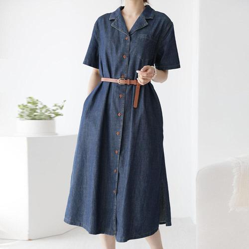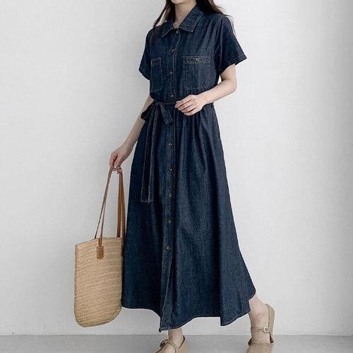 [유야]여성 벨트 세트 데님 셔츠 반팔 롱 원피스 -FOP0621- 여름