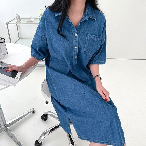 미시 캐쥬얼 데님 여름 반소매 박시핏 청 원피스 - 418