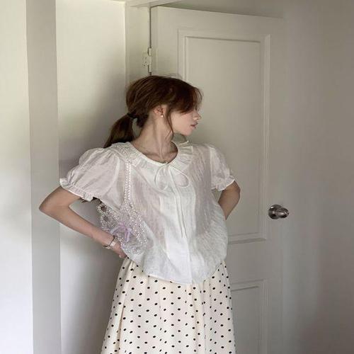 카라블라우스 리본 퍼프소매 셔츠 타이 셔링 여름반팔 WFKBWX2