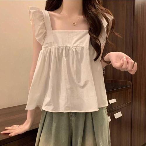 여성 리본 스트링 펀칭 블라우스 티 레이스 민소매 나시 프릴 여름 WFK6KM8