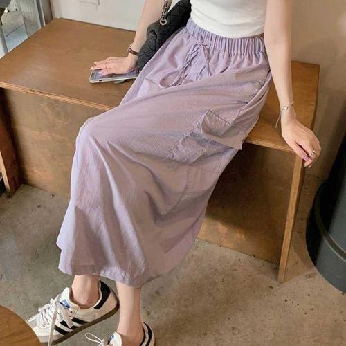 [에이치플러스몰]여름 캐주얼 연보라 블랙 미디 스커트 허리 조절 치마