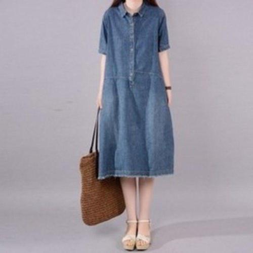 [삐까삐까]여름 청원피스 오버핏 블루 청 데님 오픈 카라 반팔 셔츠 롱 원피스