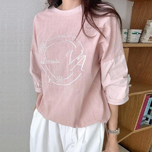 [유야]여성 밑단 스트링 면 린넨 프린팅 라운드넥 6부 7부 티셔츠 -FTS1123- 봄 여름
