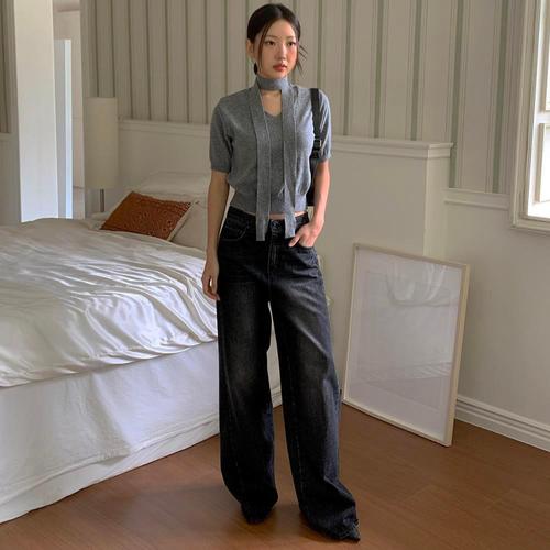 [다잇템]여자 데일리 넓은 컷아웃 블랙진 워싱 팬츠