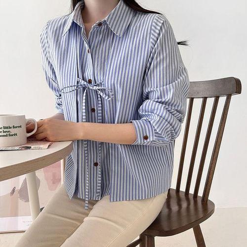 [신상오픈런]여성용 스트라이프 핀턱 리본 카라 셔츠 봄철 면 블라우스