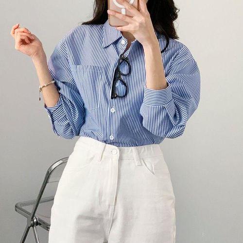 [옷자락]여성용 봄여름 통기성 루즈핏 줄무늬 셔츠