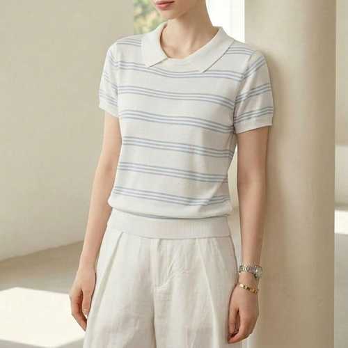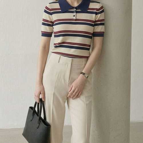 [셀럽하우스]여름 KQRW1630 브이넥 크롭 카라티 반팔 니트 스트라이프 여성