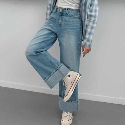 [옷자락]여자 빅사이즈 논스판 일자 워싱 와이드핏 롤업 청바지
