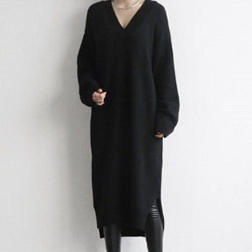 여성용 긴팔 니트 원피스 하객룩 브이넥 롱 드레스 WFLLQ17