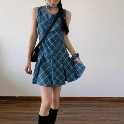 [디작소]여성 겨울 가을 모직 체크 민소매 원피스