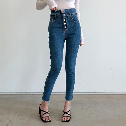 [옷자락] 여자 하이웨스트 버튼 컷팅 스키니진 스판 청바지