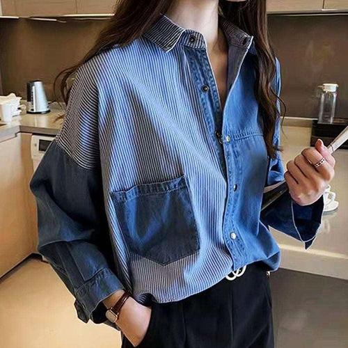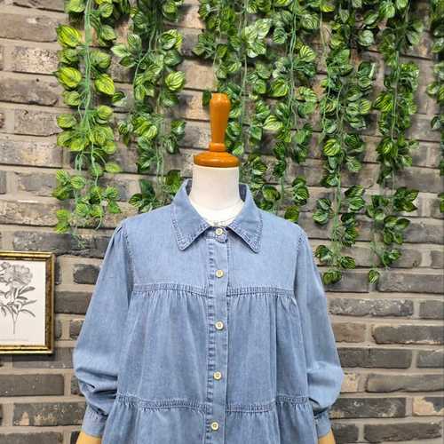 루즈핏 데님면 층층 라인 청 셔츠 블라우스