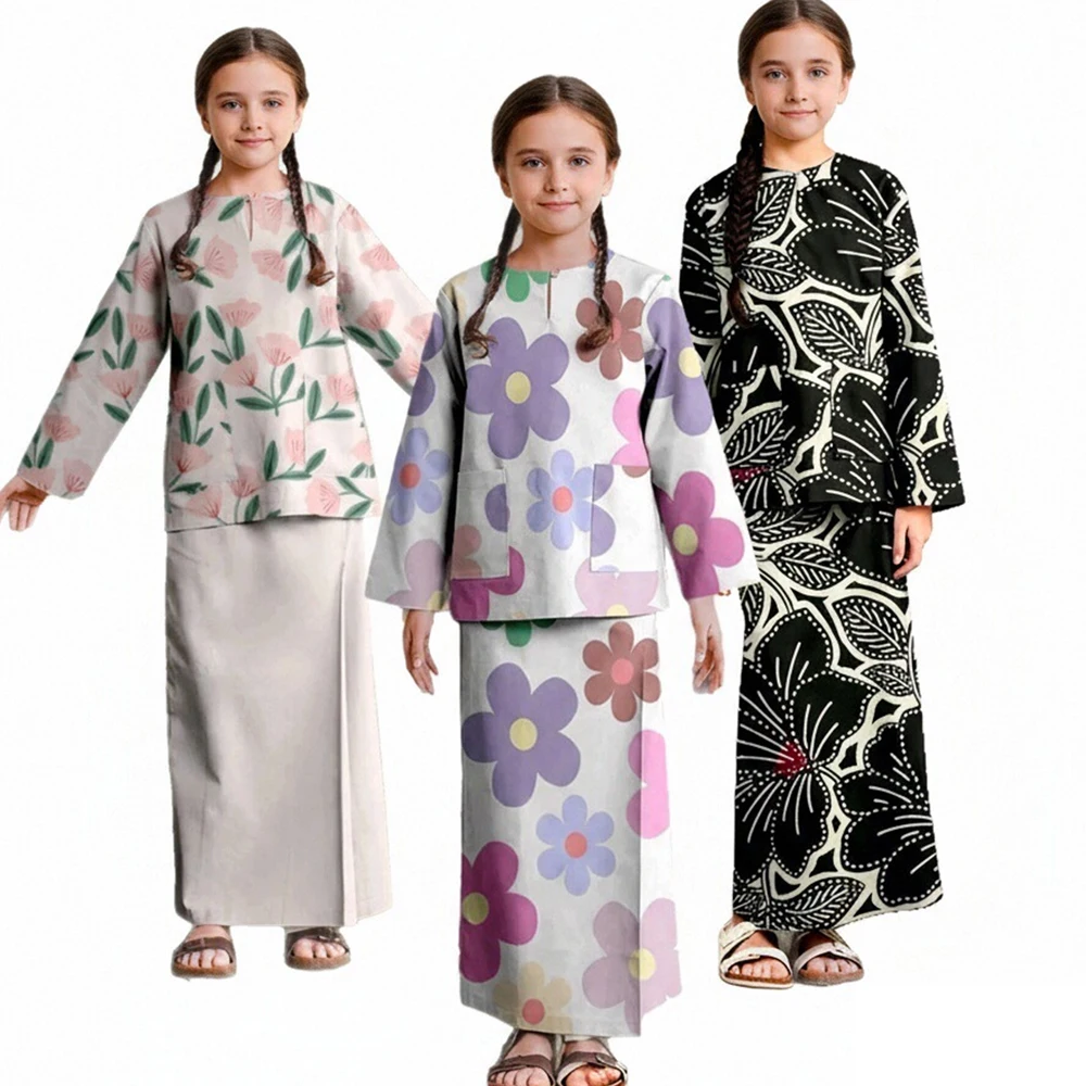 말레이시아 코스프레 의상 바주 쿠룽 슈트 동남아시아 무슬림 전통 의상 꽃무늬 프린트 긴팔 상의 롱 스커트