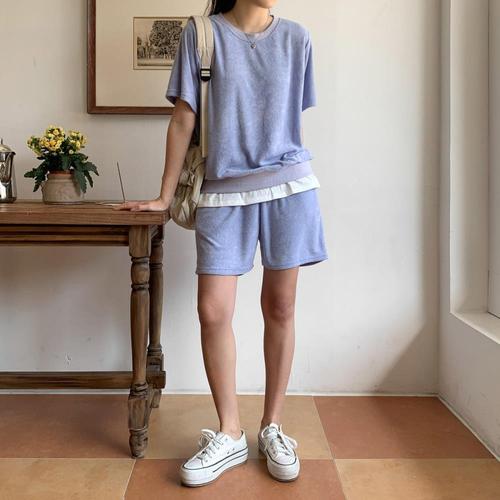 [옷자락]여자 라운드넥 레이어드 태리 긴팔 맨투맨 밴딩 4부 반바지 세트