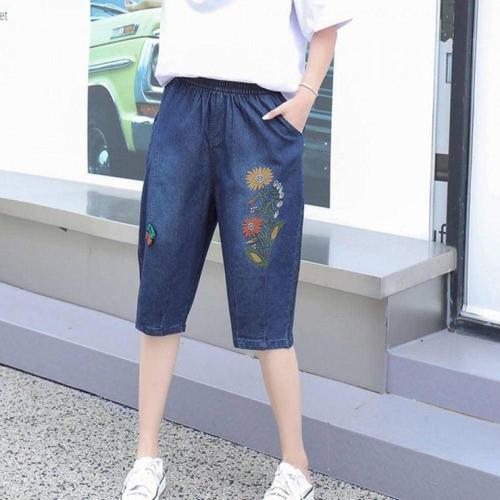 여성용 여름용 7부 데님 밴딩 청바지 자수 팬츠 WFLLNB6