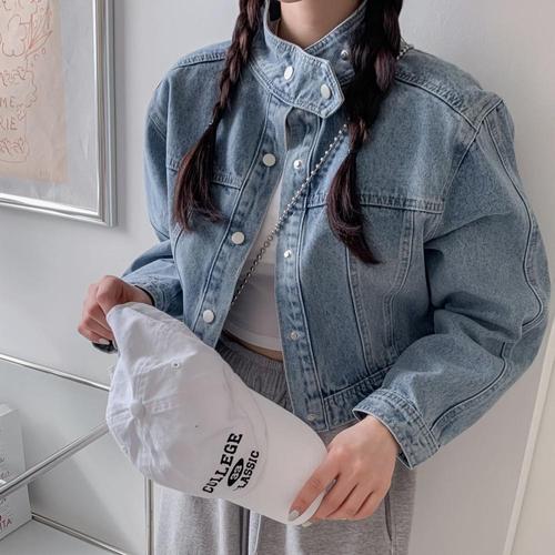 |CSJ6E75|여성 봄철 크롭 연청 하이넥 버튼 청자켓