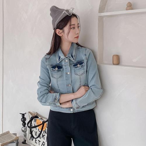 [옷자락] 여자 피크닉룩 하이넥 버튼 연청 봄 크롭 면 청자켓