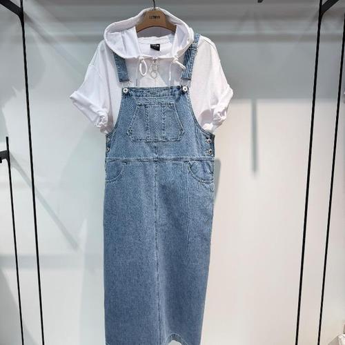 여성용 데일리 사계절 루즈핏 데님 포켓 멜빵 롱원피스 미디 청원피스