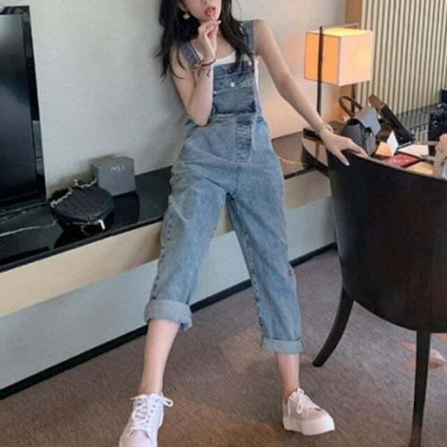 [셀럽하우스]여성 AKPI9584 데님 점프수트 청 멜빵바지 9부 크롭 오버롤