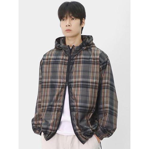 [빌리버스]빌리버스 남성 유니크 오버핏 나일론 체크 패턴 윈드브레이커 후드집업 스트링 바람막이 BLC007