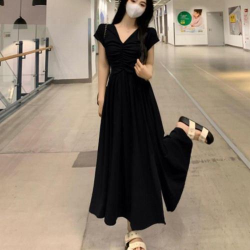 여성용 루즈핏 셔링 브이넥 반팔 롱 원피스 여름 스커트 드레스 WFLLP1M