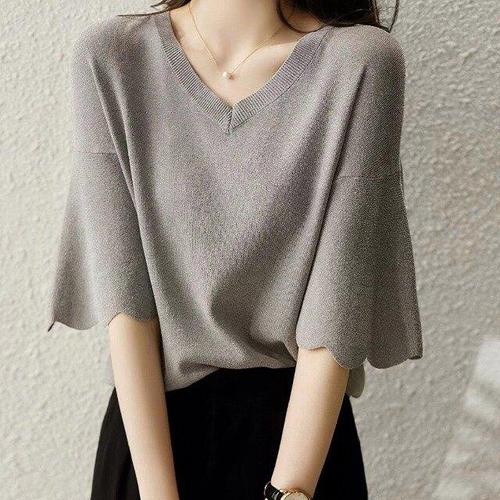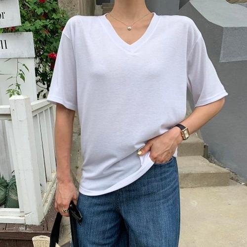 [옷자락] 여성용 봄 여름 통기성 브이넥 루즈핏 반팔티셔츠