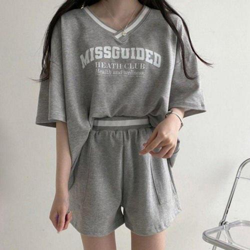 여성 브이넥 영문 프린팅 배색 반팔티 반바지 박스핏 기본 여름 WFLLMH8