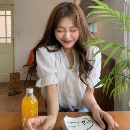 [옷자락]여성 면혼합 루즈핏 브이넥 꽃 자수 반팔 블라우스