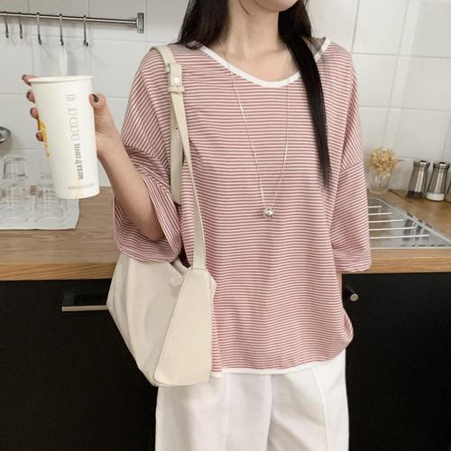 [옷자락]여자 루즈핏 브이넥 폴리혼방 스트라이프 반팔 상의