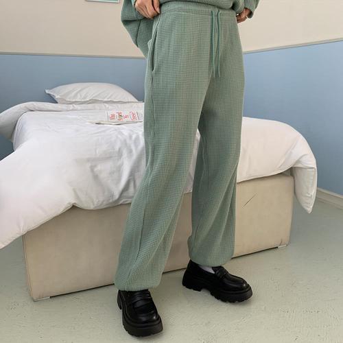 여성패션 다리가길어보이는 밑단밴딩 조거 와플 배기 WFL9IYV