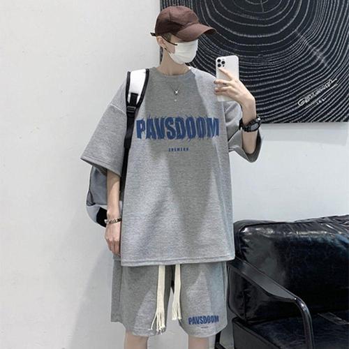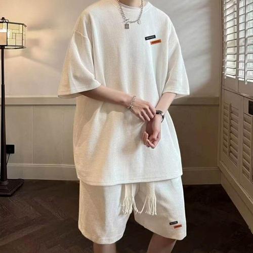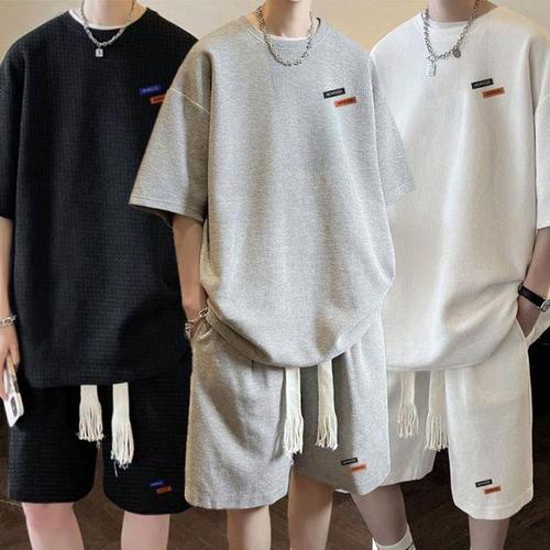 2025 여름 남성 스포츠 세트 캐주얼 티셔츠 + 반바지 세트 와플 단색 반팔 반바지 투피스 트레이닝복 루즈핏 슈트