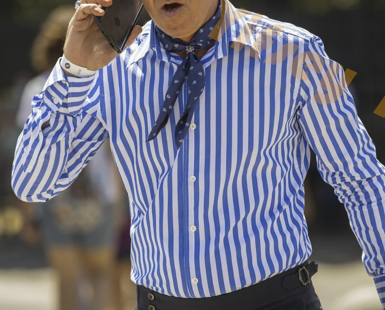 슬림한 핏과 대비되는 컬러의 칼라가 돋보이는 남성용 프렌치 커프스 단추 셔츠, 윈저 칼라, 스트라이프 포멀 긴팔 셔츠