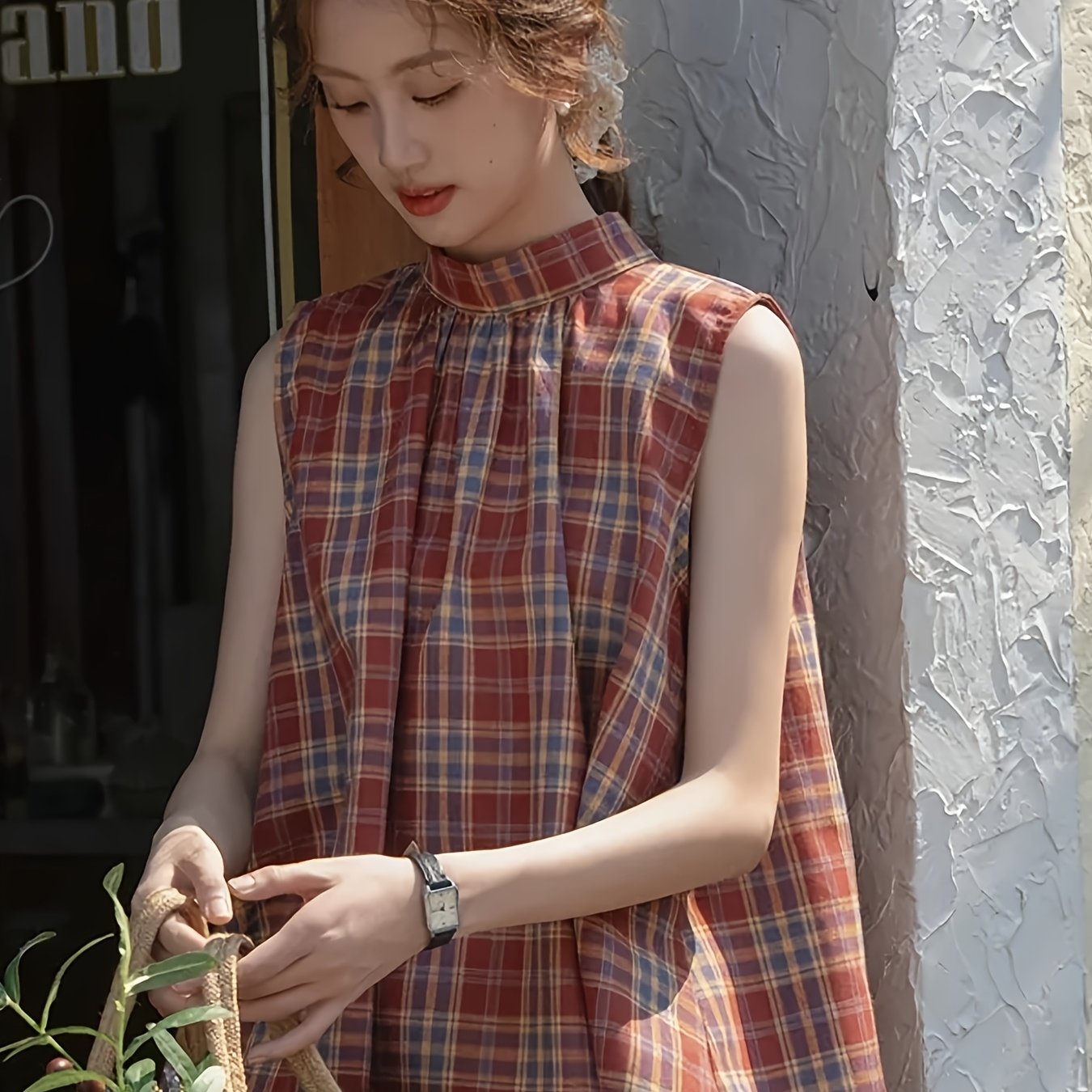 TEMU 여성용 2026년 여름 신상 디자인 하프 하이넥 격자무늬 셔츠, 독특한 스몰사이즈 민소매 베스트 탑