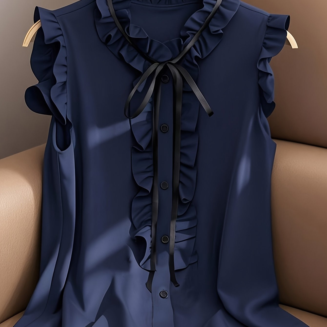 TEMU 플러스 사이즈 여성용 단색 민소매 러플 탑 | 보타이넥라인과 버튼 클로저가 있는 우아한 출퇴근용 블라우스