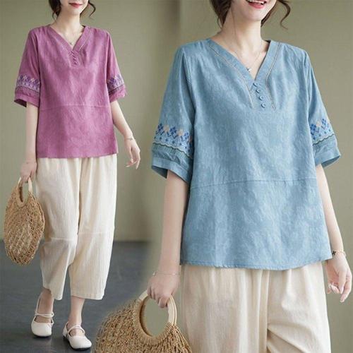 Makone 여성 린넨 7부 소매 시크 중년 엄마 셔츠 캐주얼 솔리드 자수 블라우스