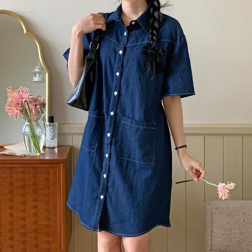 [다잇템]여자 진 주머니 허리스트랩 자수 미디원피스