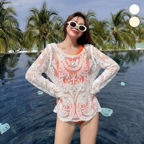 [블로썸스틸]나뭇잎 자수 수영복 커버업 블라우스