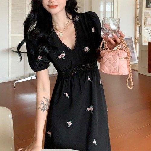 [비꼴리끄]A라인 퍼프 소매 자수 원피스 B262WO1010