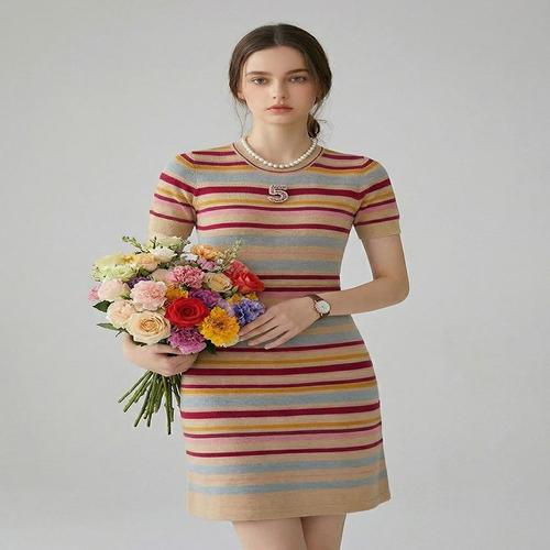 [드레스허그]파이브 자수 컬러 스트라이프 원피스
