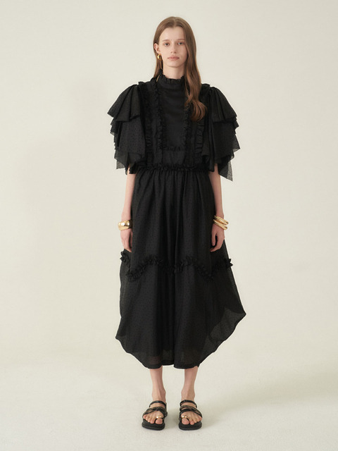 [까이에] 미니 도트 쉬폰 레이스 프론트 벌룬 점프수트