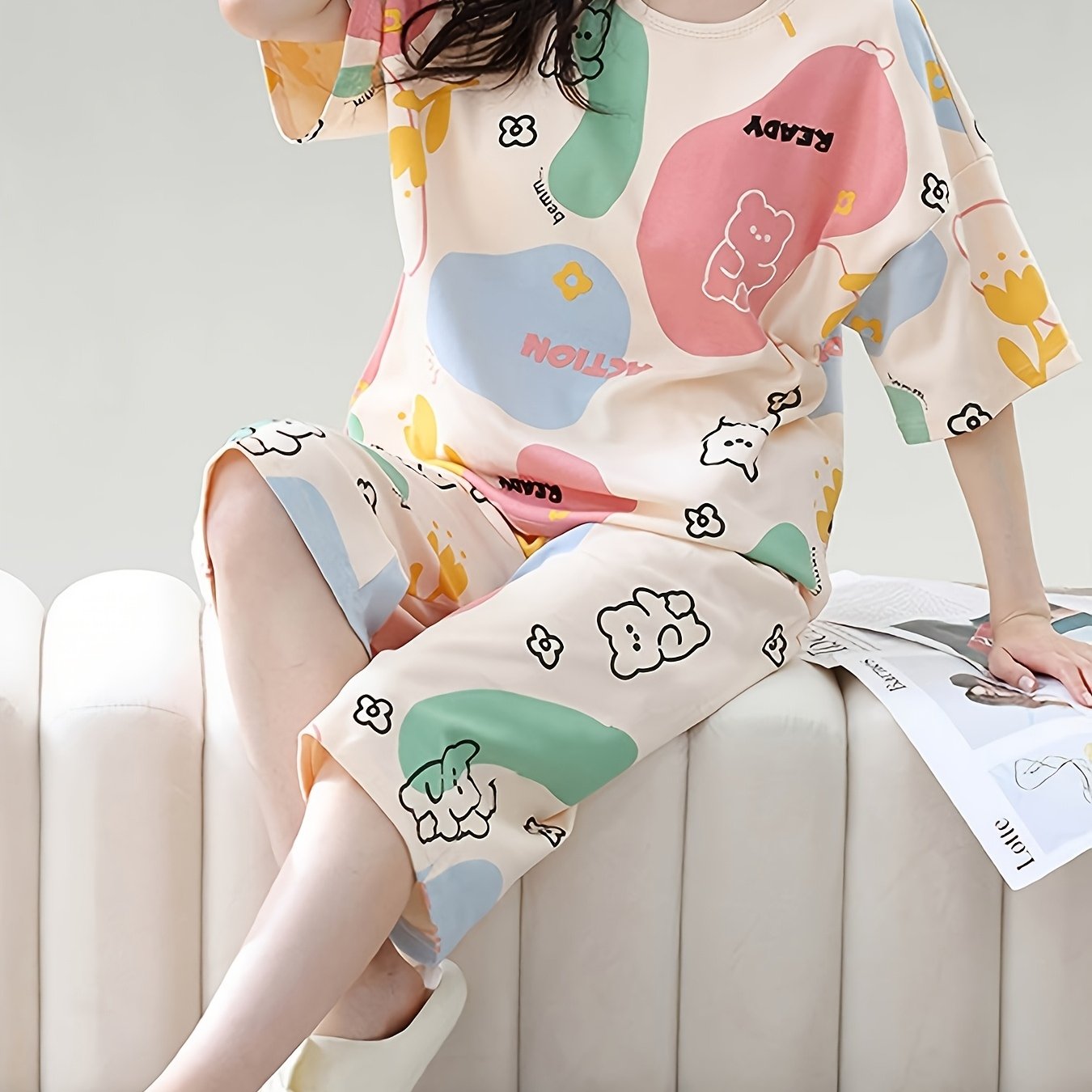 TEMU 새로운 여성용 카툰 프린트 | 컬러 블록 | 플로럴 | 브로치 프린트, 카프리 팬츠와 함께. 봄/여름 여성용 파자마 세트