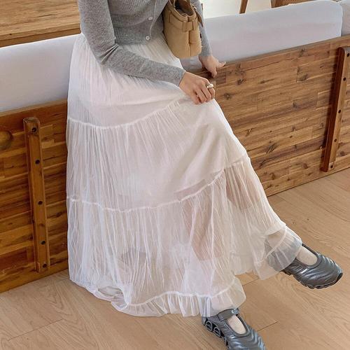 [옷자락]여자 데이트룩 발레코어 쉬폰 주름 프릴 캉캉 롱스커트