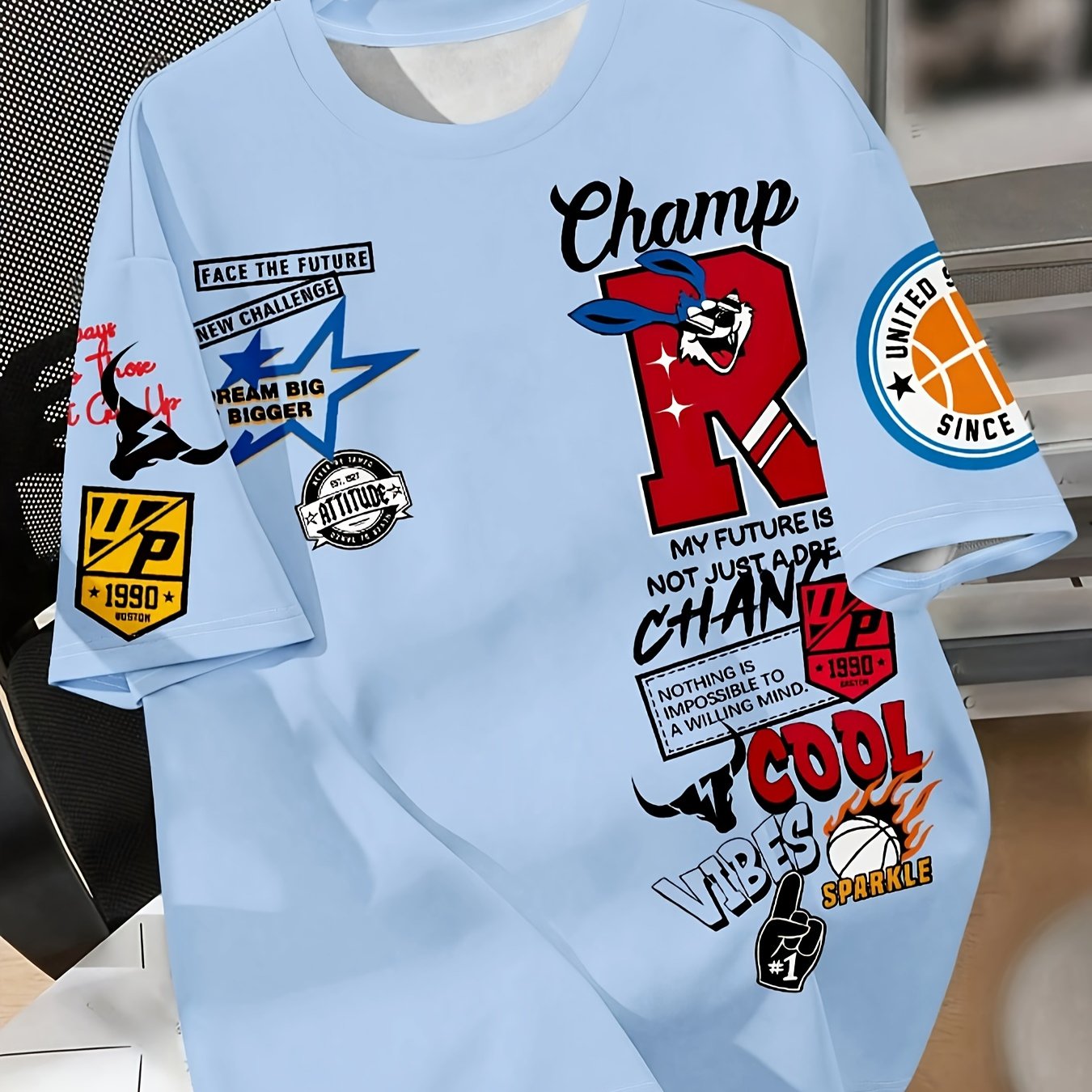 TEMU 남성 패션 그래픽 프린트 티셔츠 - 농구, 별, 슬로건이 있는 'R' 레터 디자인, 캐주얼 라운드넥, 반팔, 여름 스타일, 데일리 티셔츠 | 트렌디 캐주얼 스타일