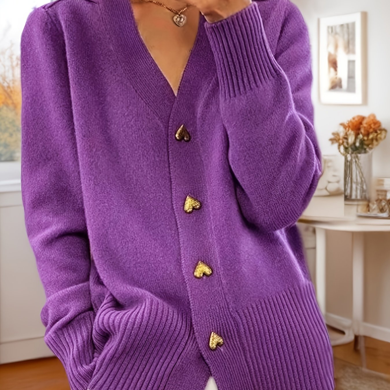 TEMU 여성용 라벤더 V넥 카디건 스웨터 하트 버튼 디자인 - 봄/가을용 편안한 긴팔 , 세탁기 사용 가능 캐주얼~세미포멀 아우터웨어 (단색, 비침 없음)