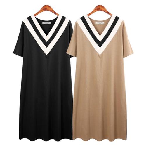 [허밍퍼플]여성용 6509-테니 V 롱 원피스 빅사이즈 브이 넥 면 쮸리 베이지 트렌드 여름 플러스 여성의류