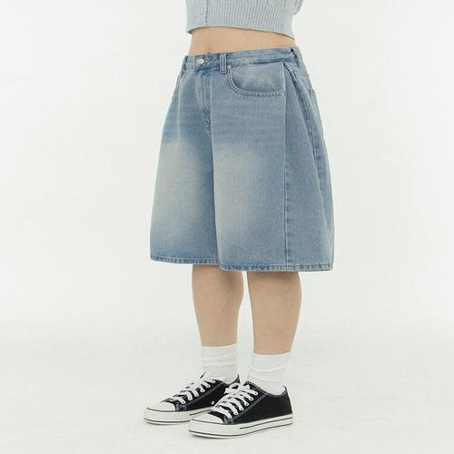 [진마니아]사이드 핀턱 포인트 와이드 5부 하프데님 남여공용 (연청)