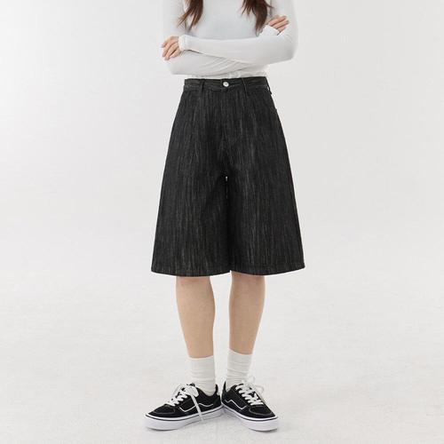 [진마니아]남녀공용 스트라이프 텍스처 5부 버뮤다 데님 팬츠 (블랙)