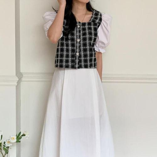 여자 스퀘어넥 트위드 진주버튼 코튼소매 반팔 블라우스